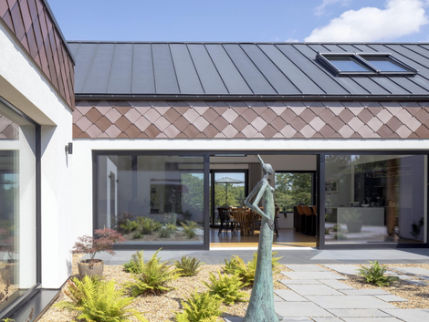 Triple-glazed alu-clad windows with a U-value of 0.75 W/m²K, alongside a large south-facing glazed section and courtyard layout, optimise solar gain and privacy. The structure also accommodates an integrated air source heat pump and 6kWp photovoltaic system.